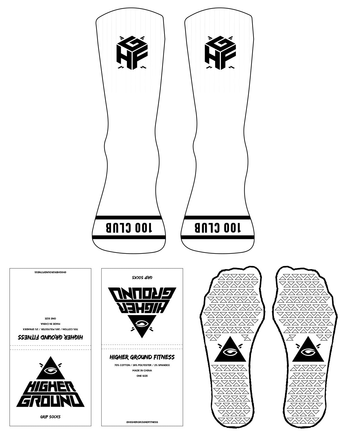 The 1/2 Crew Sock - White - Higher Ground - Left And Right - Top Icon - Bottom - 100 Club Text - 2 Lines In Between Text - Black - Triangle Shape Grip - Black