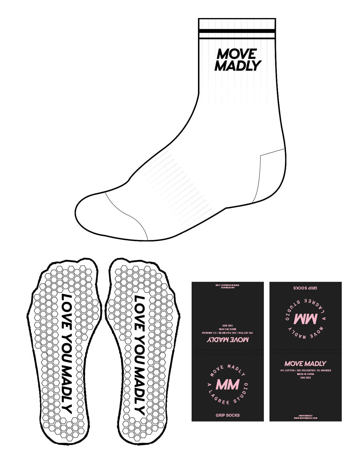 The 3/4 Crew Sock - White - Move Madly - 2 Lines - Center Stacked - Black - Hexagon Shape - Grip - Black