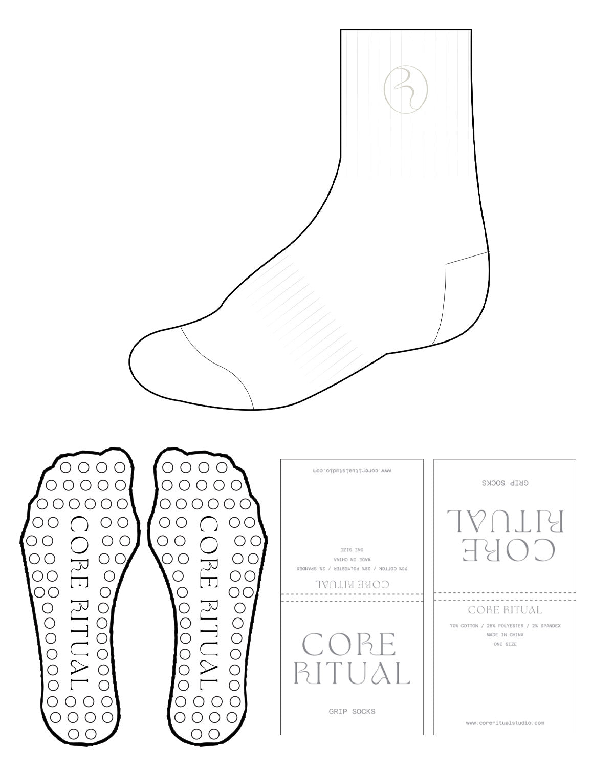 The 3/4 Crew Sock - White - Core Ritual - Top Center Round Icon & Bottom Text - Black Circle Grip
