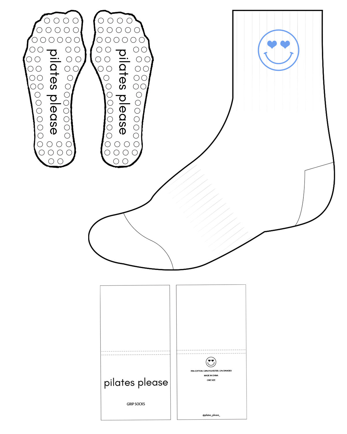 The 3/4 Crew Sock - White - Pilates by Nix - Center - Smiley W/ Heart Eyes - Blue - Grip - Blue