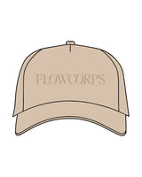 The 5 Panel Trucker Hat - Sand - Flowcorps - Front Center - Puff Embroidered Tone on Tone