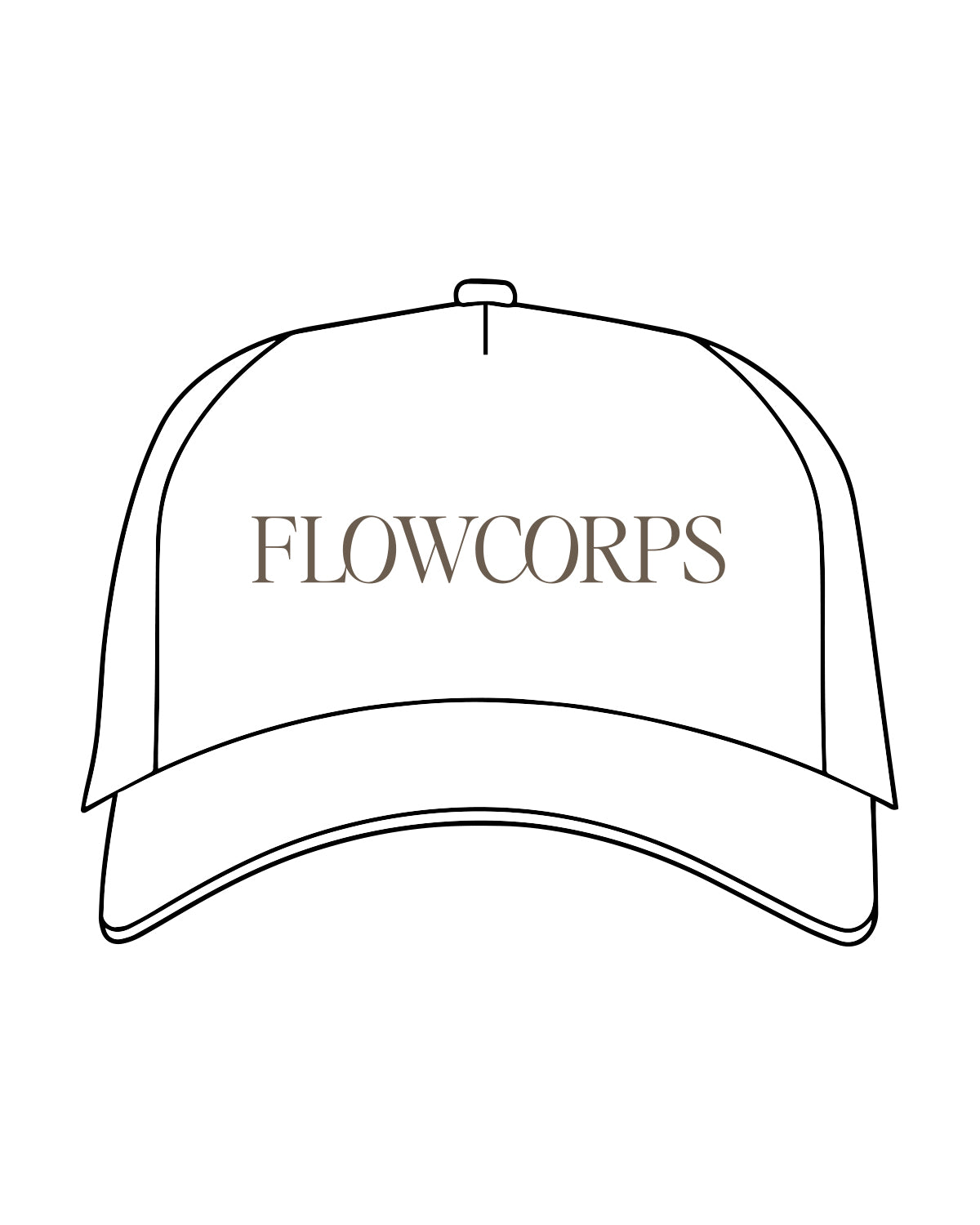 The 5 Panel Trucker Hat - White - Flowcorps - Front Center - Puff Embroidered Umber