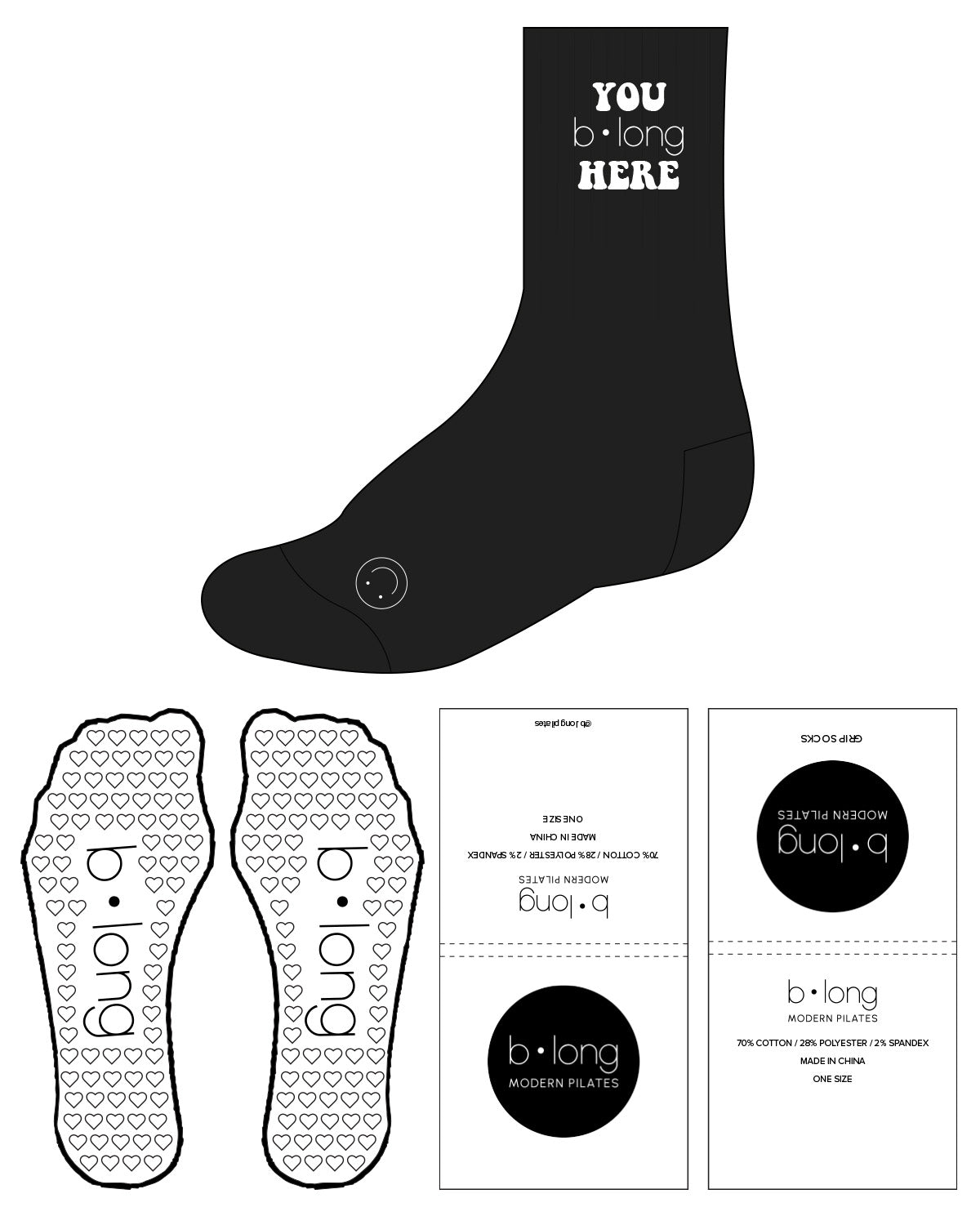 The Crew Sock - Black - B Long Pilates - Top Stacked & Bottom - Heart Grip - White