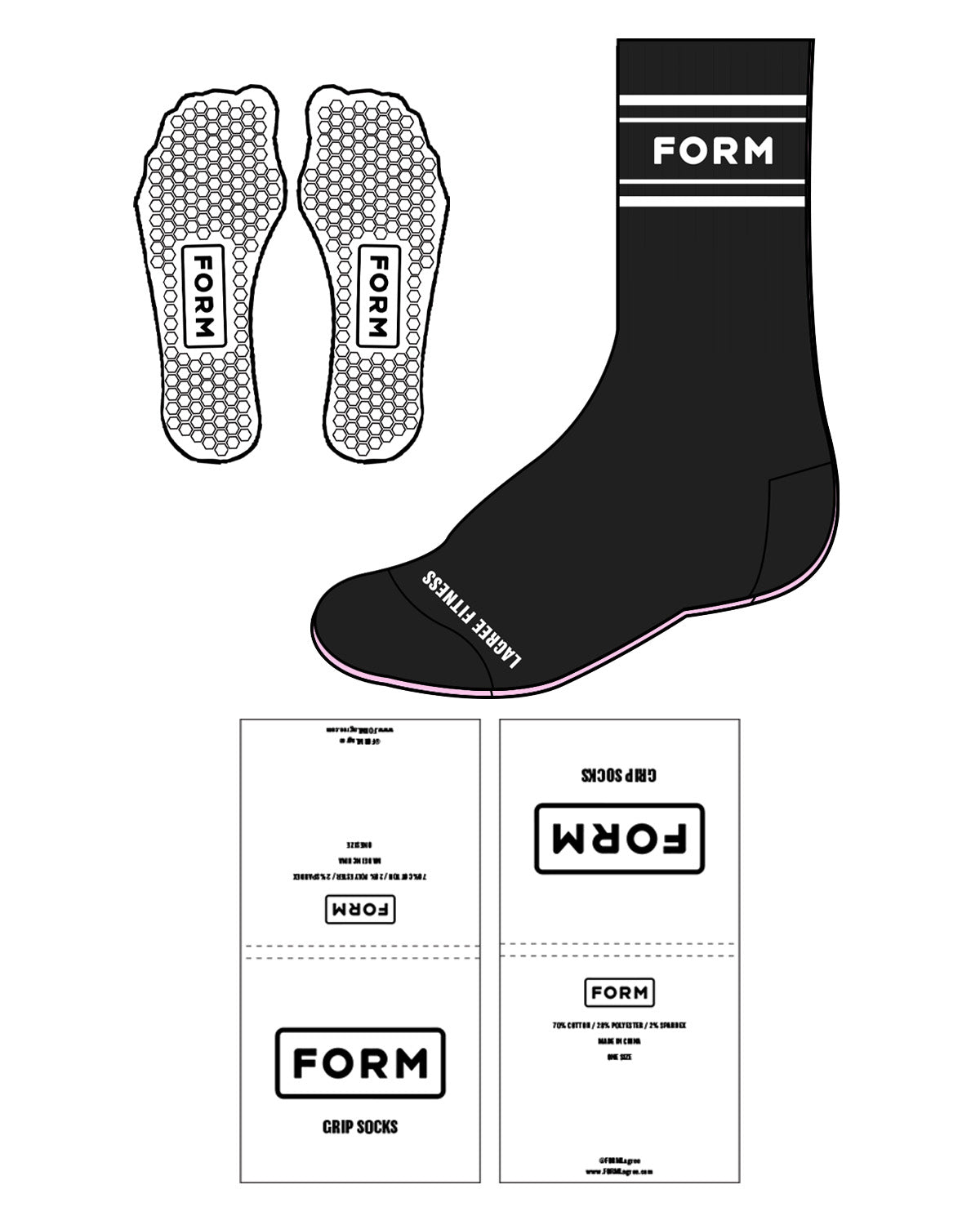 The Crew Sock - Black - Form Lagree - Center - 2 Lines & Text - Bottom Center - Hexagon - Form - Grip - White