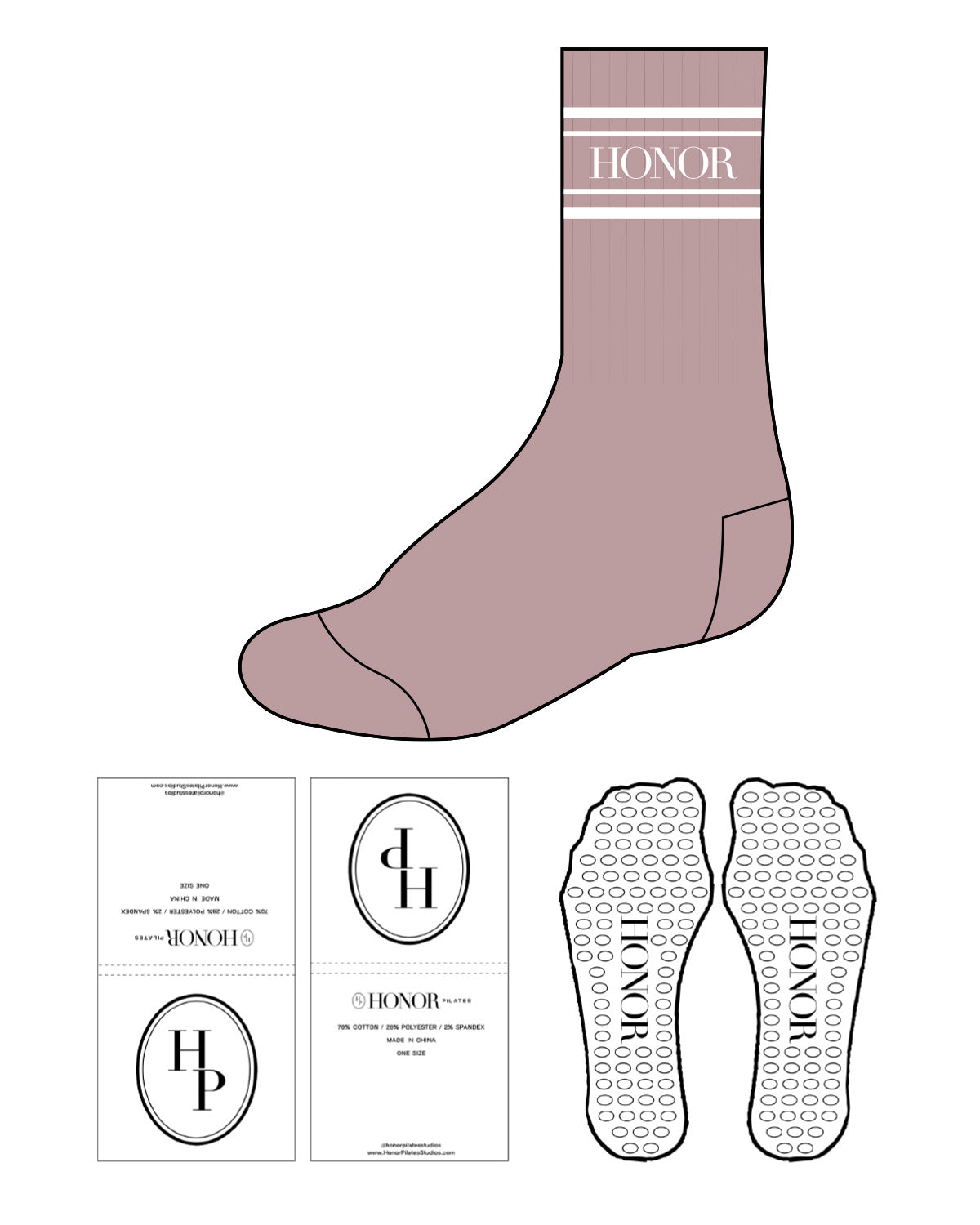 The Crew Sock - Mauve - Honor Pilates - Top Dual Border & Oval Grip - White