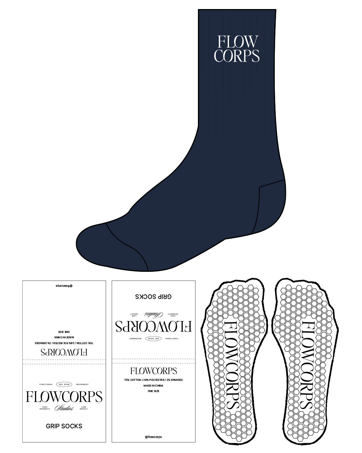 The Crew Sock - Navy - Flowcorps - Top Stacked - White Hexagon Grip - Embroidered White
