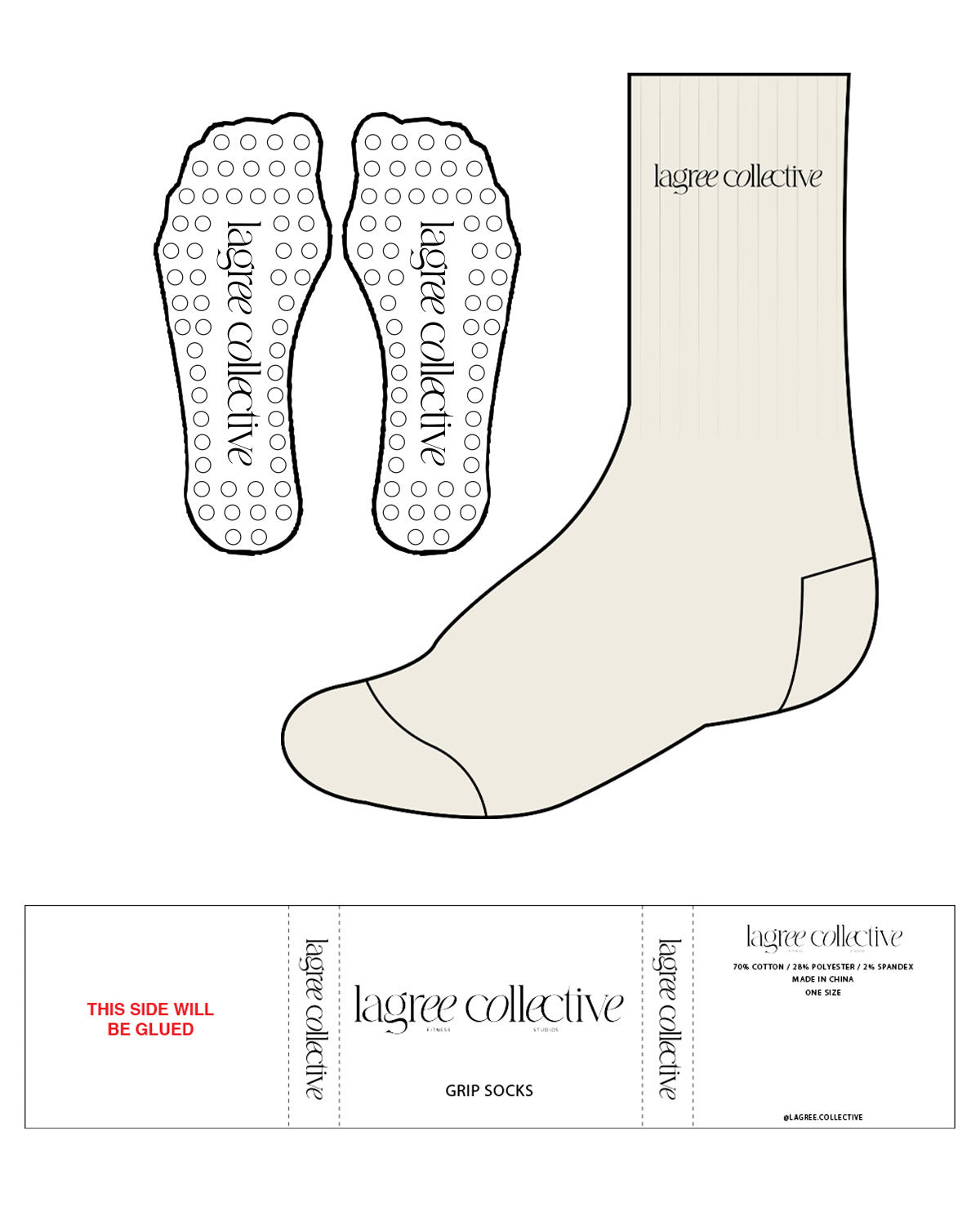 The Crew Sock - Off White - Lagree Collective - Top Text - Black - Circle Shape - Transparent Grip