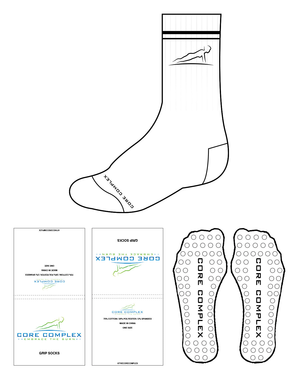 The Crew Sock - White - Core Complex- 2 Lines - Man Sketch - Bottom Text - Black - Circle Shape - Black Grip