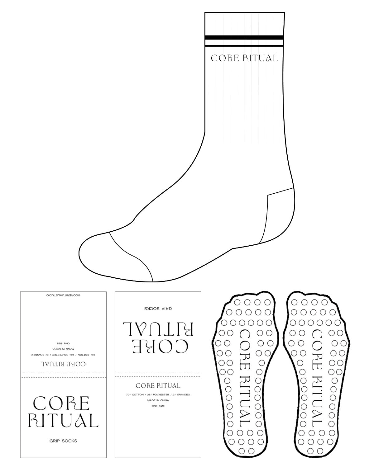 The Crew Sock - White - Core Ritual - Top Center - 2 Lines - Black Circle Grip