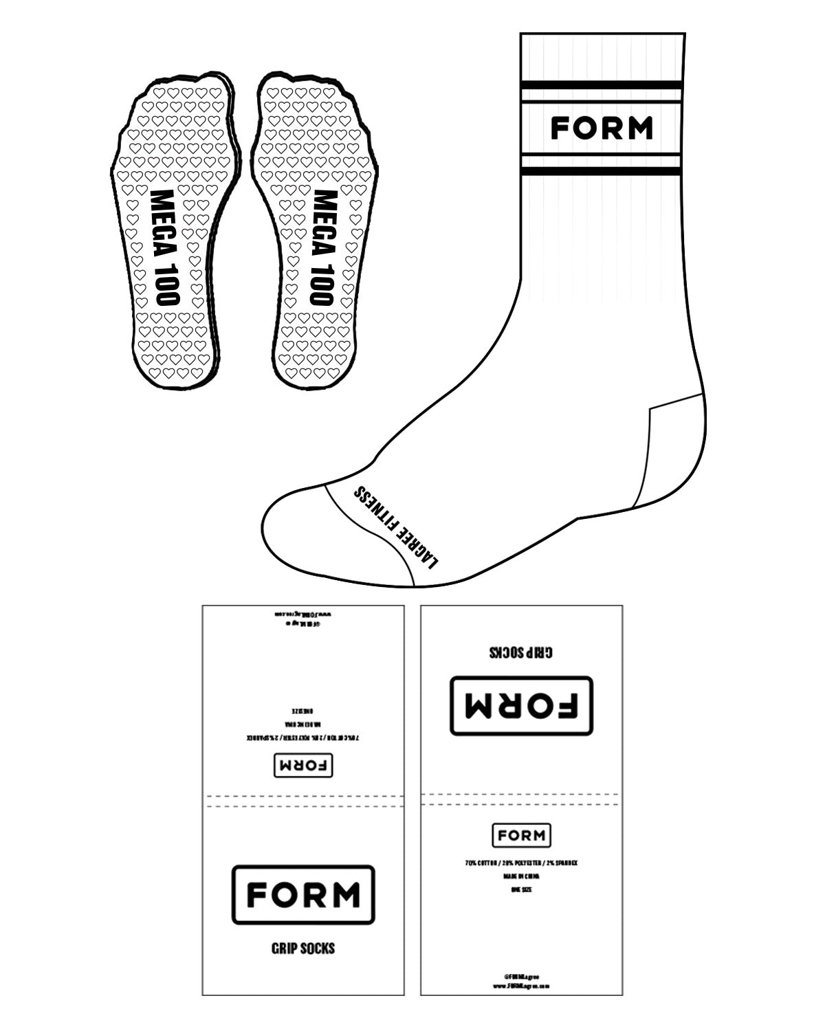 The Crew Sock - White - Form Lagree - 2 Lines & Text - Bottom Center - Heart Grip - Mega 100 -Black