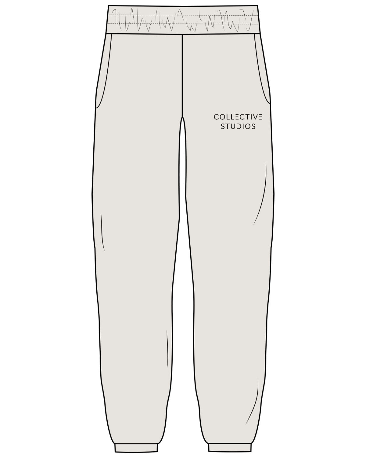The Mens Sweatpants - Washed Bone - Collective Studios - Left Leg - Below Pocket - Text Stacked - Black