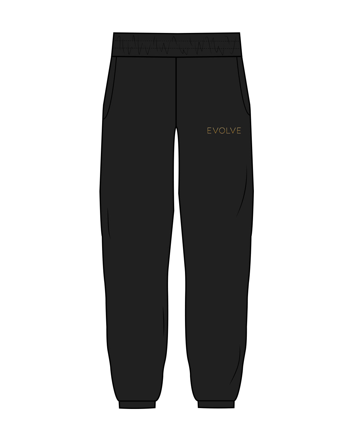 The Womens Sweatpants - Black - Evolve Spa - Left Leg - Below Pocket - Embroidered - Gold